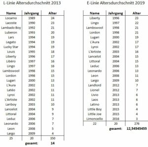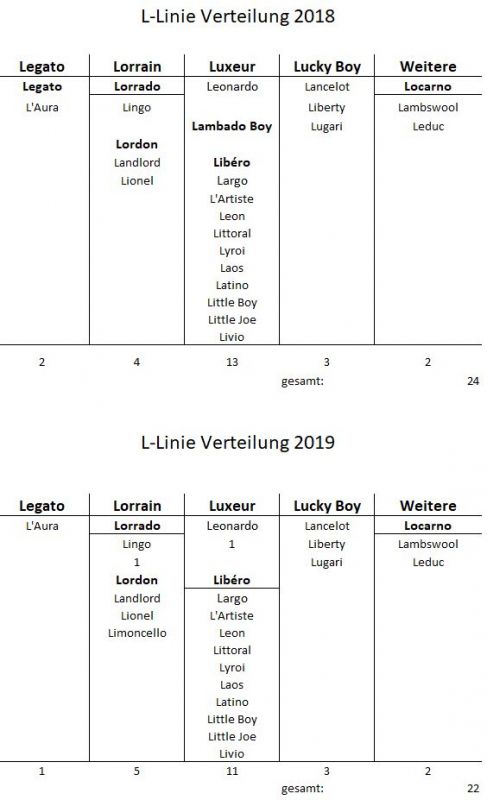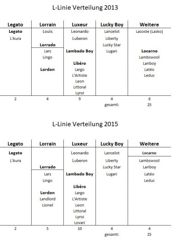 - 2019 Limoncello (Lionel) angekört, Legato und Libéro und Lambado Boy stehen der Zucht nicht mehr zur Verfügung, Fridolin (Lyroi) steht in Deutschland ebenfalls nicht mehr zur Verfügung