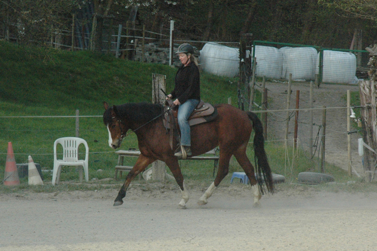 Queshya geht gut vorwärts, ist nachgiebig im Maul, lässt sich leicht abwenden und tritt gut rückwärts. An Stabilität fehlt es noch, Shya lehnt mit der Kruppe nach innen. Tanja gab mir den Tip in den nächsten Wochen daran zu arbeiten die Schulter und die Hinterhand am längeren Zügel zu verschieben um sie dann darüber besser in den Rücken holen zu können. Mein rückwärts lehnender Sitz hat mir die erhoffte Entspannung im Oberkörper gebracht und das Becken ist auch freier. Tanja meint jetzt muss ich meinen Sitz wieder nach vorne korrigieren, damit ich die Beine besser fallen lassen kann.