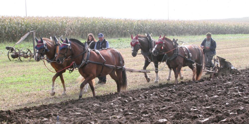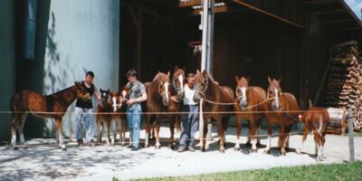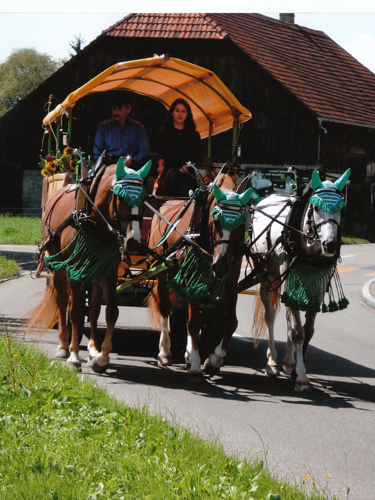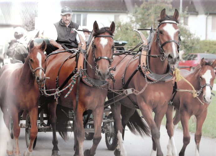 In der Küche der Familie Messer fällt uns das Foto eines pflügenden Vierspänners sofort ins Auge. Die drei Füchse auf dem Bild, sind alle aus einem Guss. Auf Nachfrage erzählt uns Herr Rudolf Messer, dass es sich um seine Zuchtstute Fleurette (Lusco/Urique) und deren Nachkommen, Fiona (Calif/Lusco) Franco (Calif/Lusco) und Canella (Calif/Lusco) handelt.
